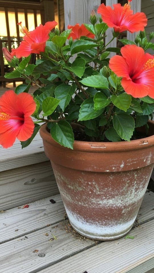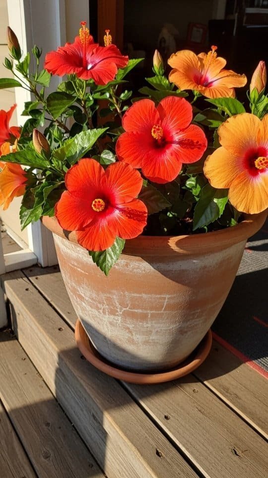 Hibiscus flowers shine in warm sunlight. Their bold colors look stunning in a rustic clay pot. I always make sure to use rich soil with good drainage.