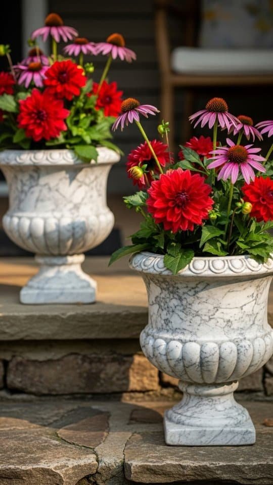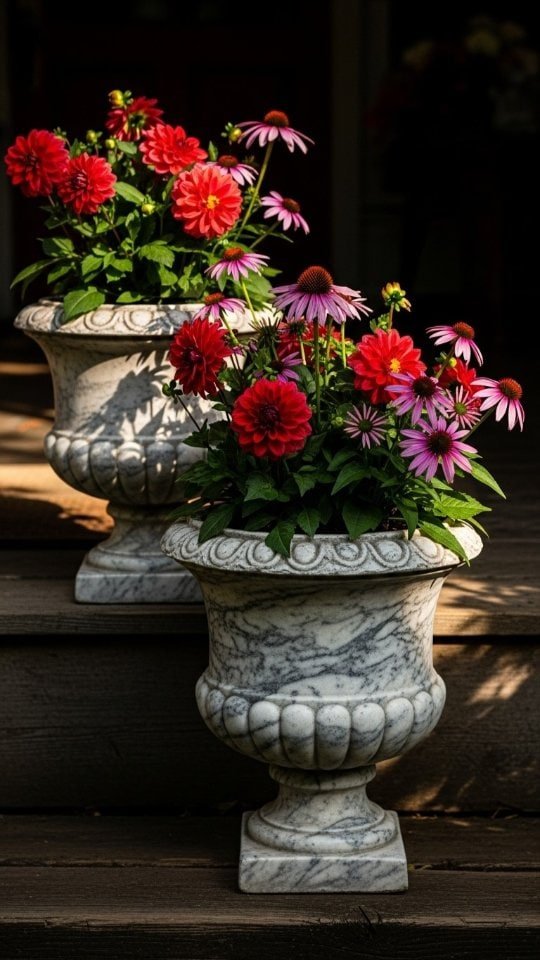 Marble urn planters add timeless beauty to any garden. I love how the smooth, natural stone gives an elegant look. Coneflowers and dahlias thrive in these sturdy pots.