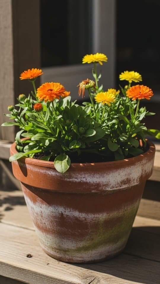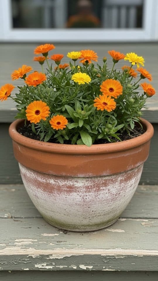 Pot marigolds bloom brightly in terracotta pots. These flowers thrive outdoors with proper care. I always choose terracotta for its breathability and earthy look.