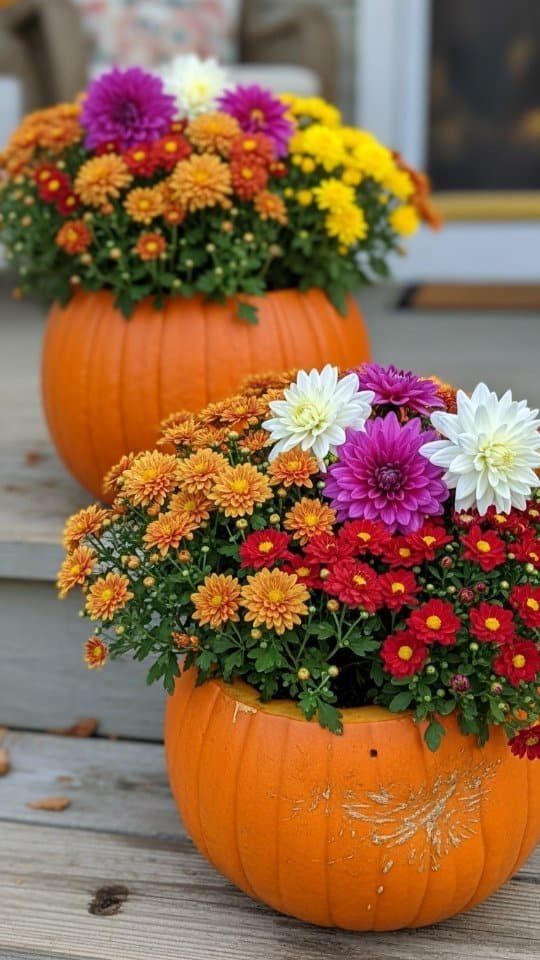 I love turning orange pumpkins into bright autumn flower planters. I scoop out the inside, then fill them with potting soil and seasonal plants like Celosia or Ornamental Mustard.