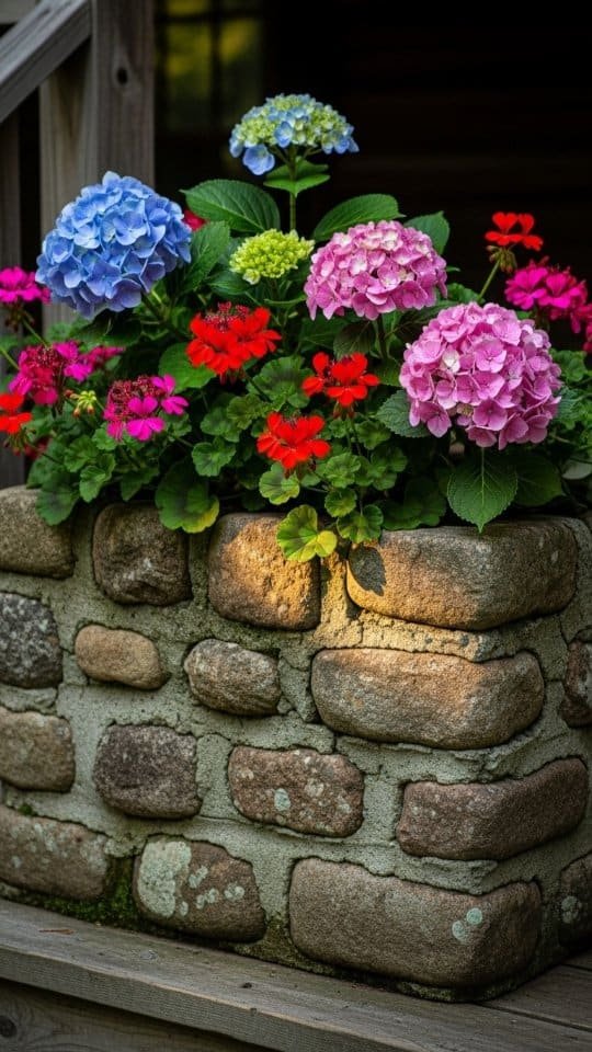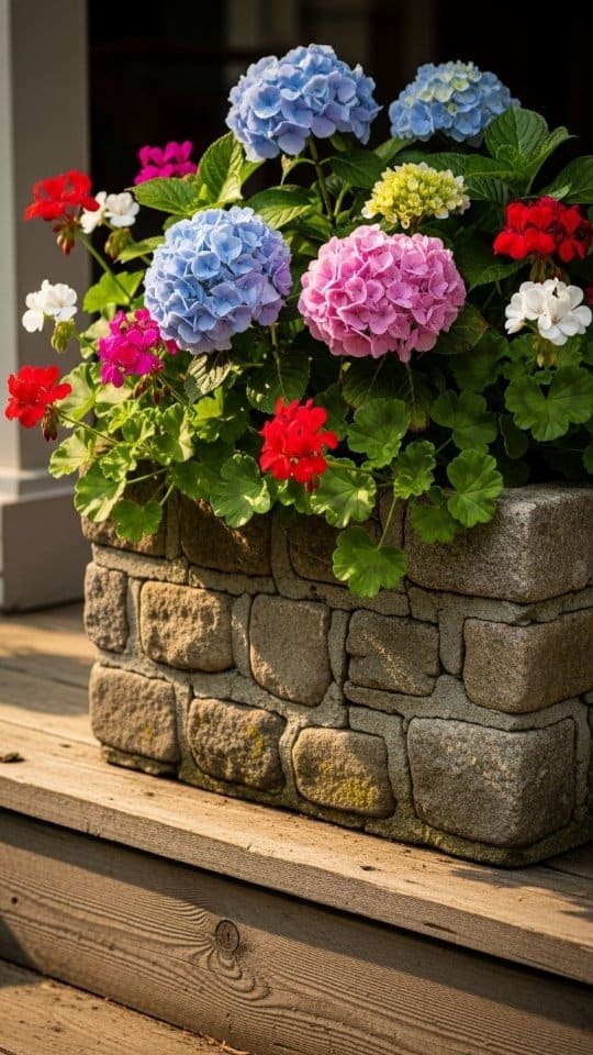 Square stone pots stay strong in any weather. I like using them to hold bright hydrangeas and geraniums. These flowers pop with color, making my patio or garden path lively.