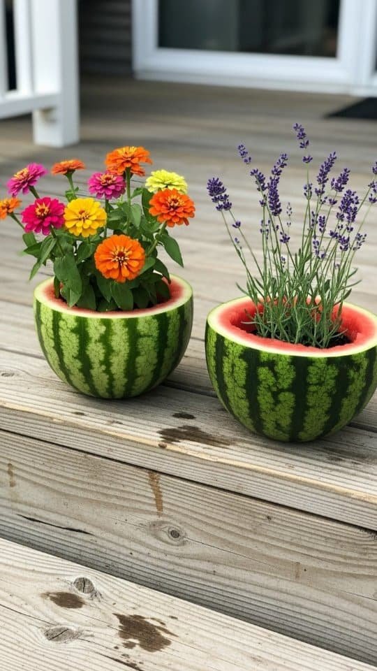 I carved a watermelon to make a fun flower pot for my porch. It was easy! I picked one with no marks and cut a small piece off the bottom, so it wouldn’t roll.