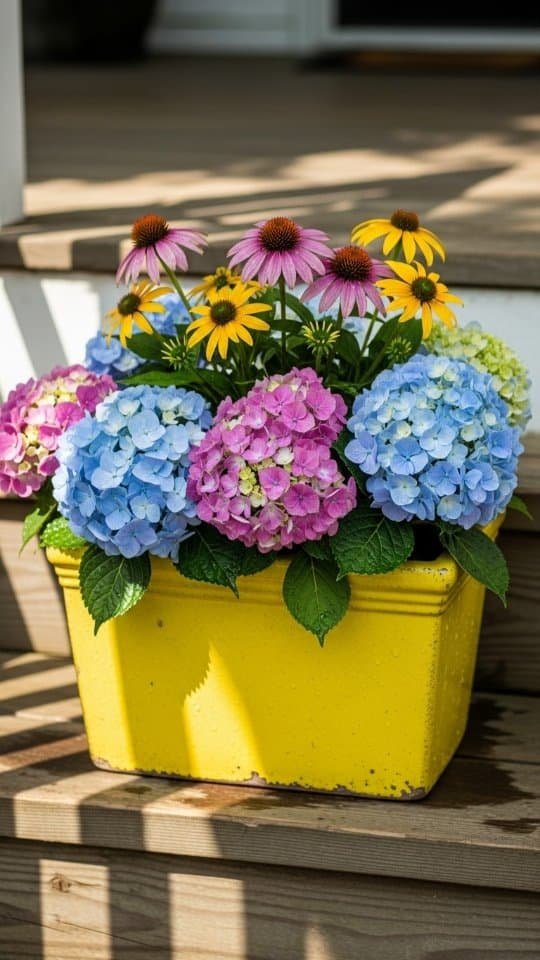 Bright yellow pots pop in any garden. Hydrangeas and coneflowers fill them with vivid colors. These shrubs thrive in the South, adding charm to my porch.