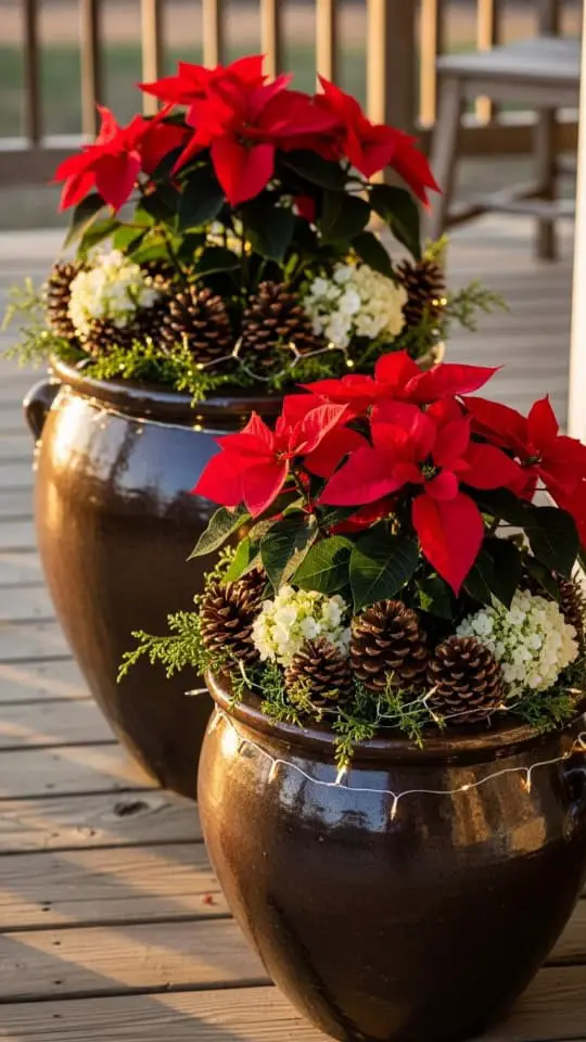 Tiered flower pots catch my eye each time, but holiday planters steal the show in winter. Bright poinsettias fill outdoor containers with vibrant red and green colors.