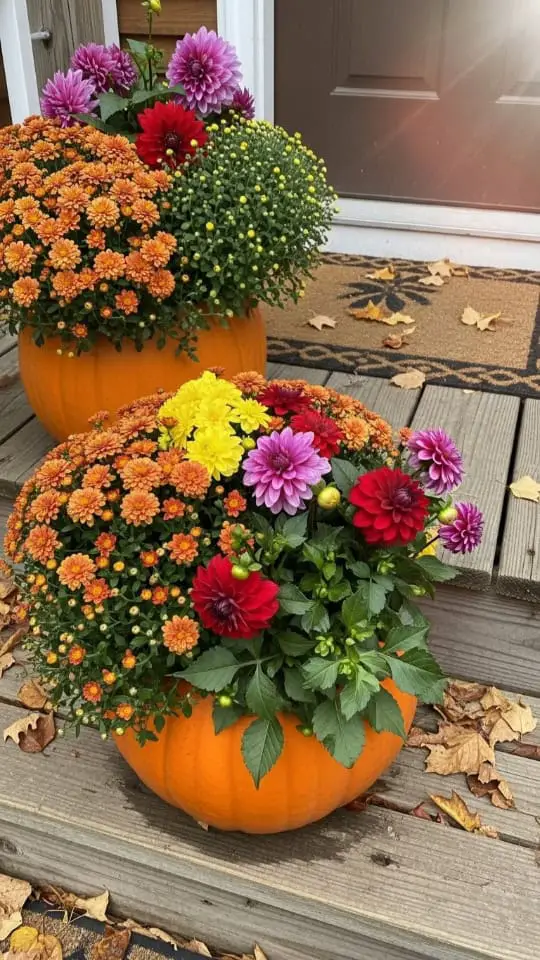 I love turning orange pumpkins into bright autumn flower planters. I scoop out the inside, then fill them with potting soil and seasonal plants like Celosia or Ornamental Mustard.