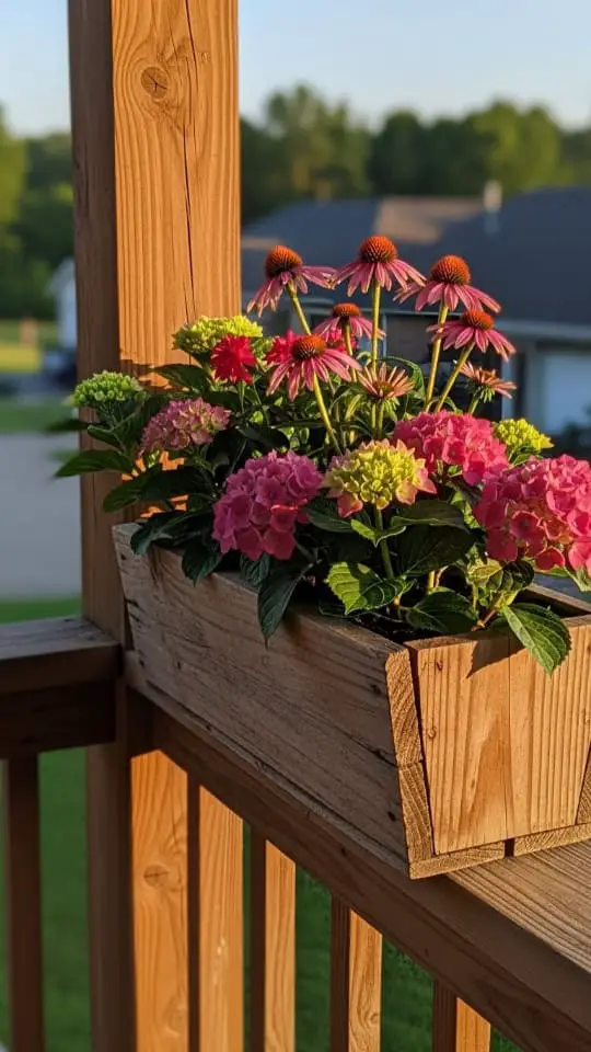 A wooden rectangle planter adds a rustic touch to patios or gardens. I like pairing tall coneflowers at the back and shorter hydrangeas in front for balance.