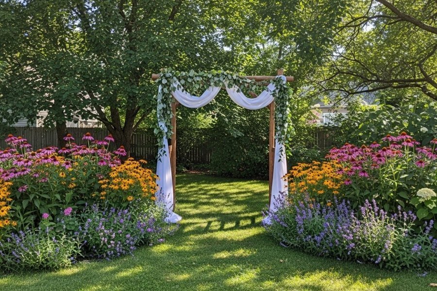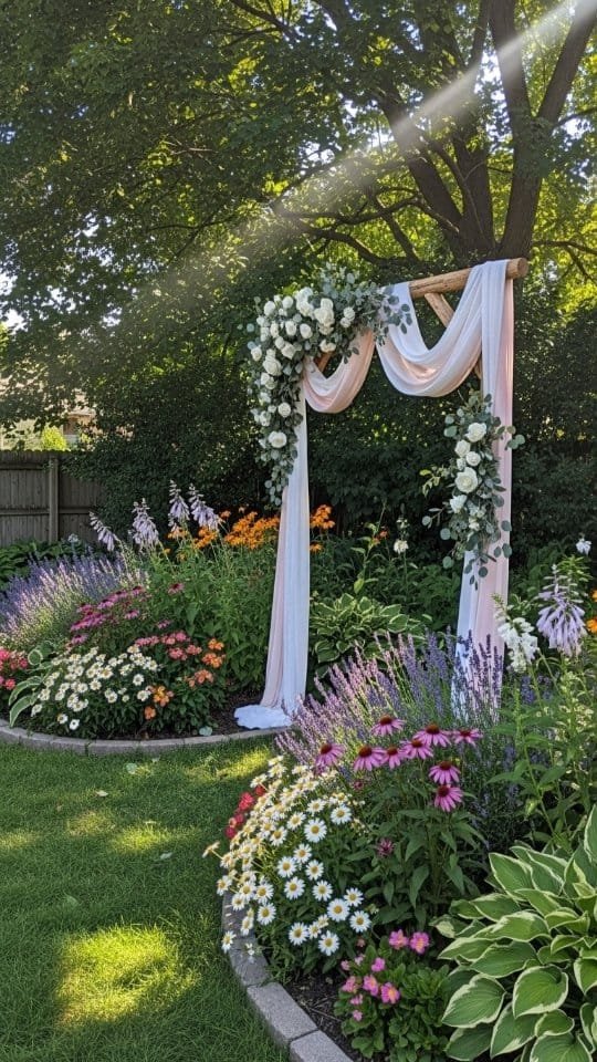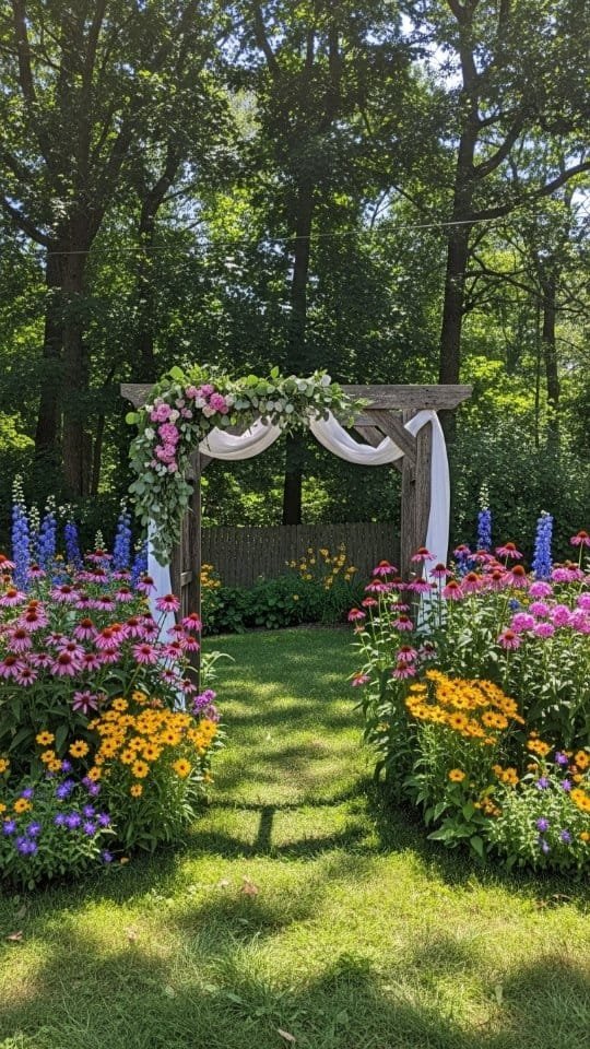 A garden arch covered in summer-blooming perennials sets a dreamy wedding scene. I love using climbing roses or Russian sage for their bold colors and sweet scents.