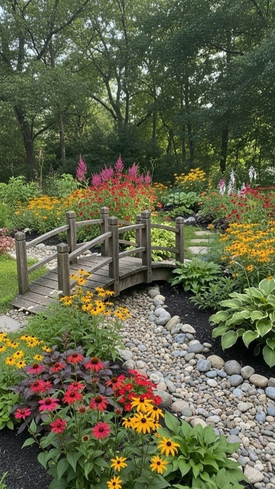 Adding shade-loving plants, such as brunnera or rhododendrons, near the bridge creates texture that feels calm yet vibrant.