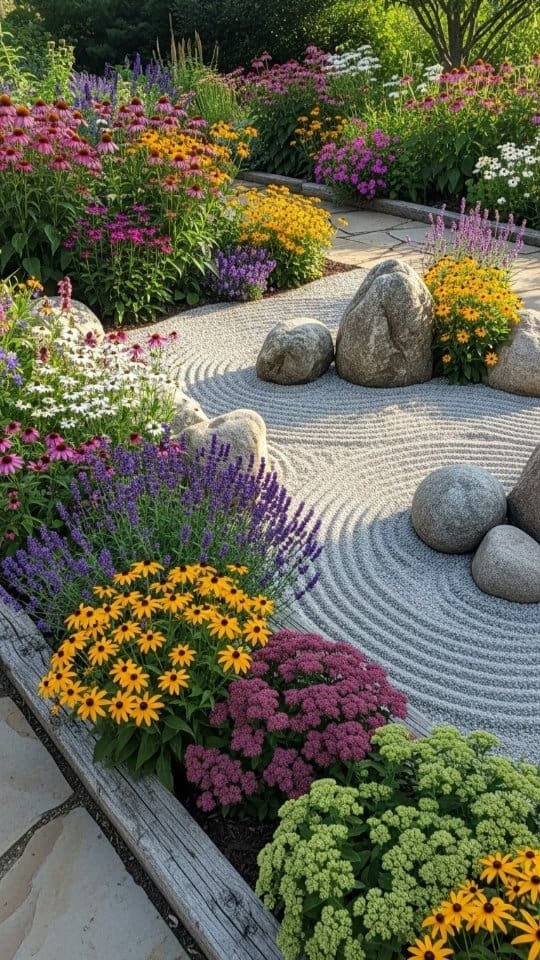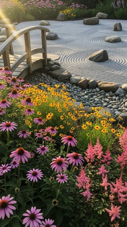 Adding smooth rocks or raked sand highlights the natural look of perennials. This setup feels simple yet elegant. A small wooden bridge over pebbles adds charm too.