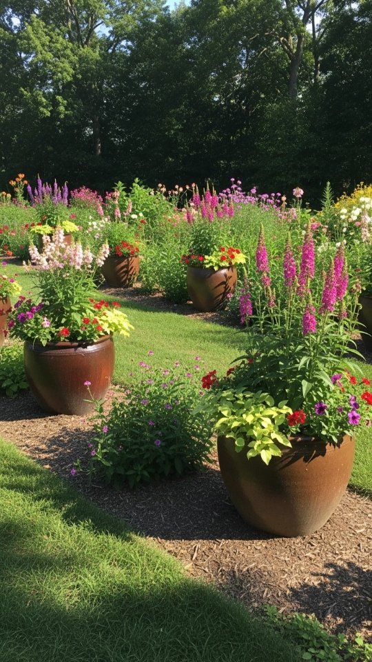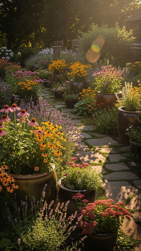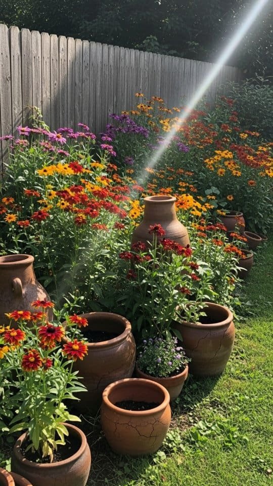Rustic clay pots bring a cozy charm to any garden. I love using them for perennials that thrive in tough clay soil. Flowers like Aster, Bee Balm, and Black-Eyed Susan fit perfectly.