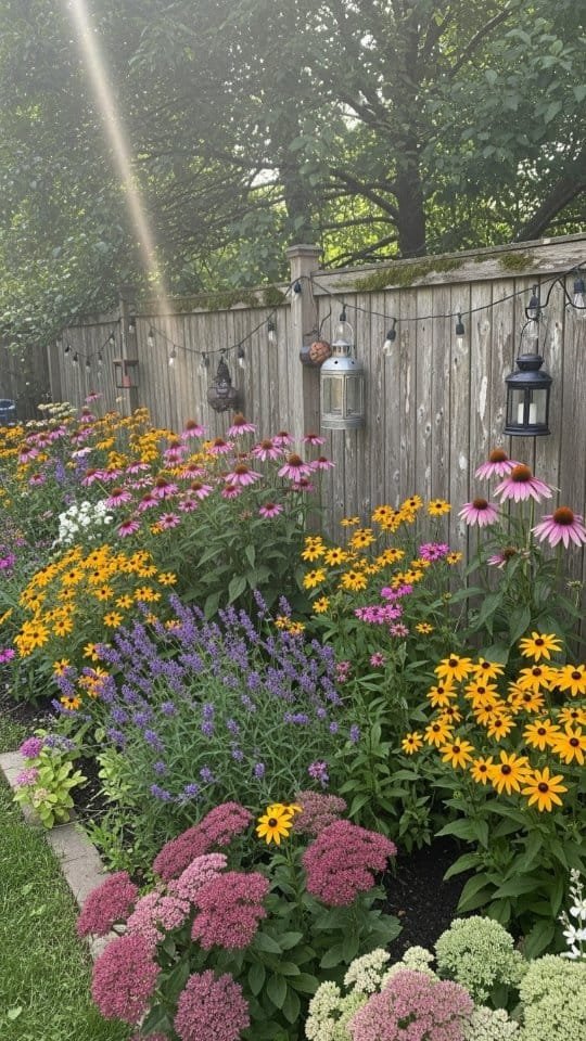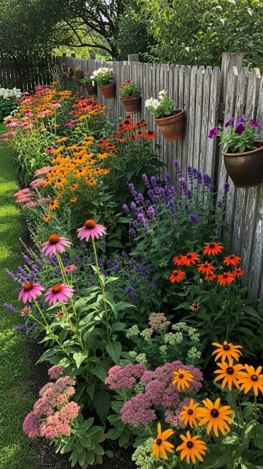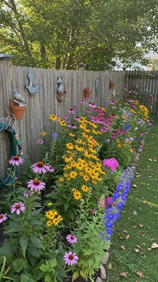 Bright perennial flowers can turn a plain wooden fence into something beautiful. I like using summer-blooming perennials like Coreopsis or Coneflower for sunny spots.