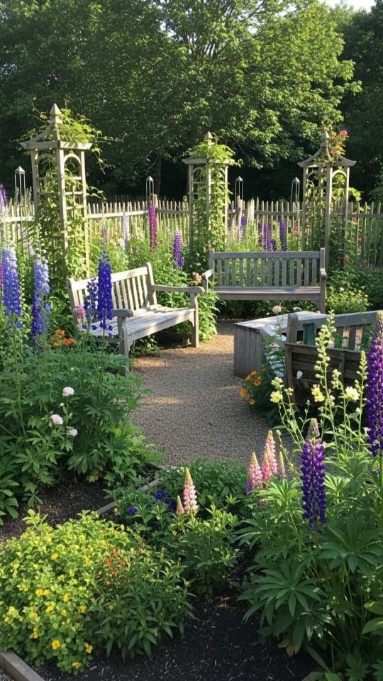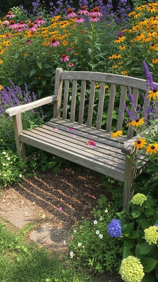 I love placing benches near summer-blooming perennials for constant color during warm months.