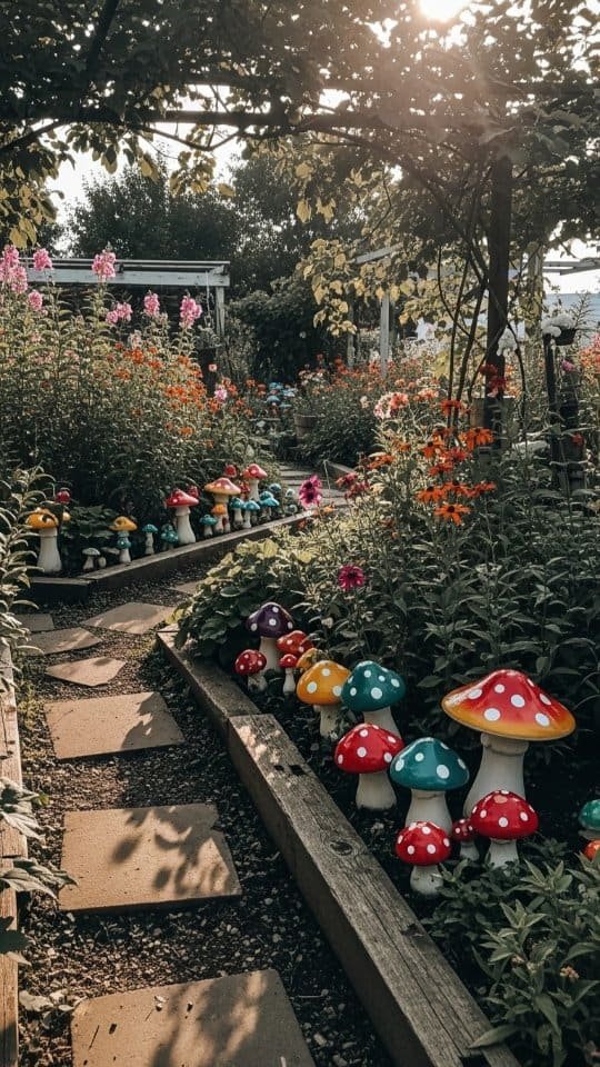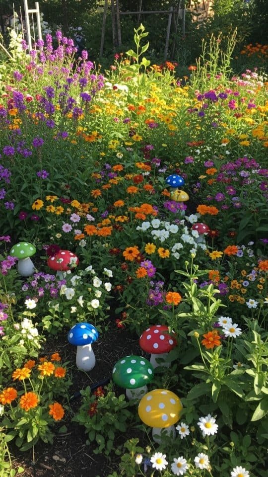 Bright perennial flowers make the mushrooms stand out even more. The mix of colors adds interest to the garden design.