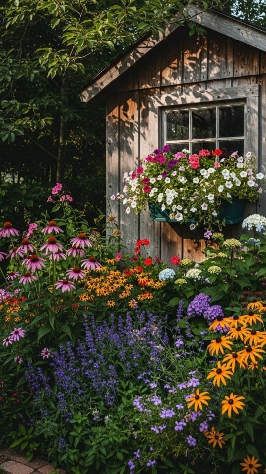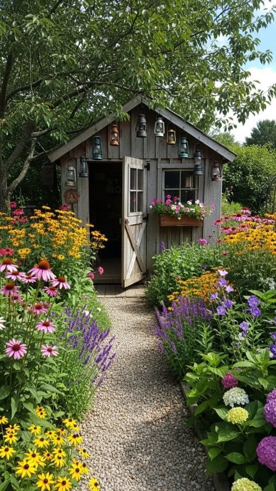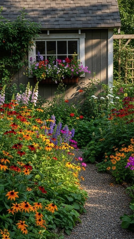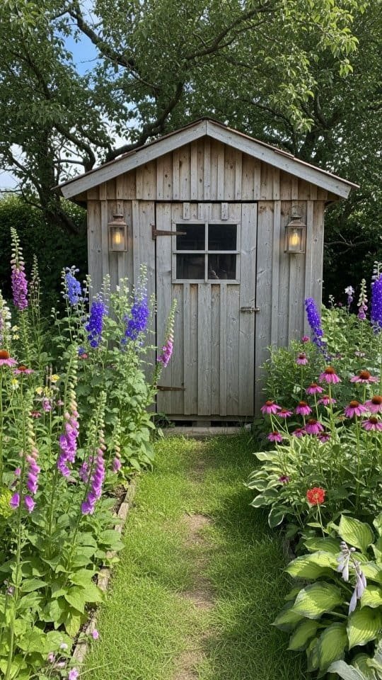 A rustic shed looks magical with colorful perennial flowers all around. I like planting summer-blooming perennials, like day lilies or Russian sage, near my shed to keep the area lively.