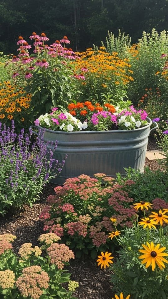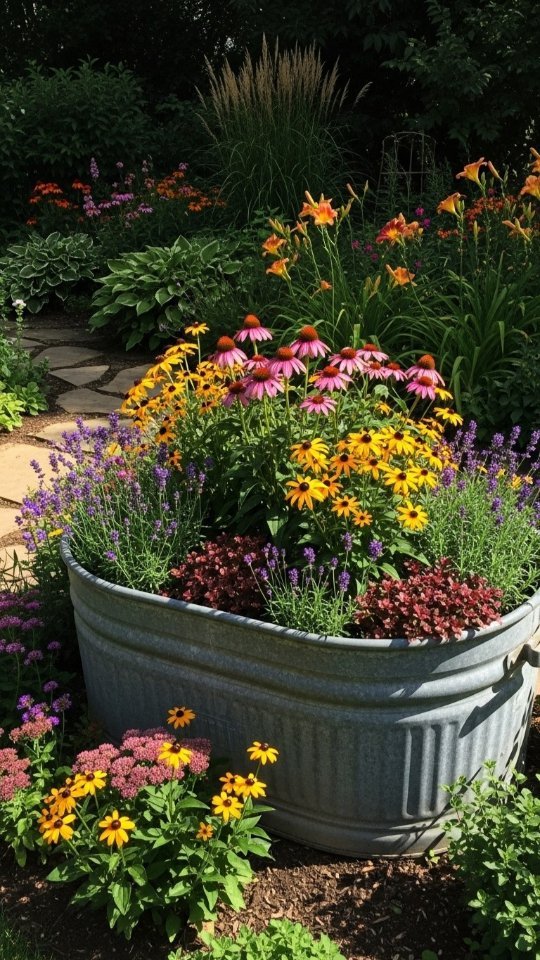 I fill my tub with summer-blooming perennials like day lilies or Russian sage from seeds or cuttings to keep costs low. It’s eco-friendly and easy!