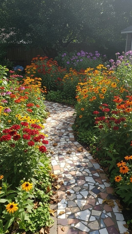 A curved mosaic path can transform any garden space. I like how bright perennial flowers, like daylilies or bee balm, add pops of color along the edges.