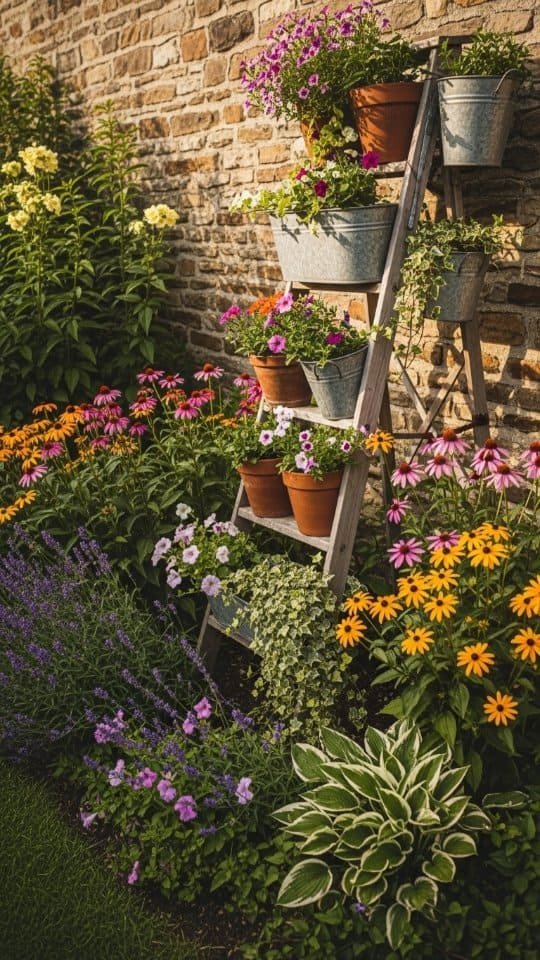 I love using a rustic ladder in my garden. It makes the space more fun and cozy. I stack pots of summer-blooming perennials like day lilies and Russian sage on each step.