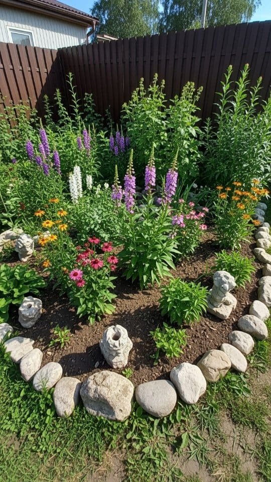 Bee Balm attracts pollinators, while moonlight-blooming perennials glow at night. I use layered planting for depth and shadowy charm.