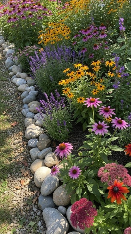 Stones and bright perennials make a garden look alive. I like using groundcover perennials like creeping thyme to fill gaps. They spread quickly and add color in summer.
