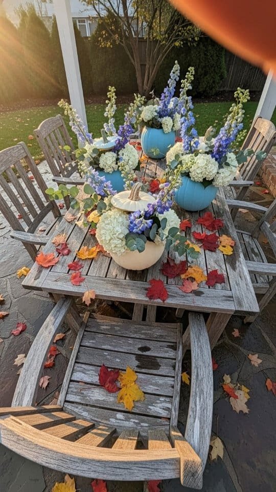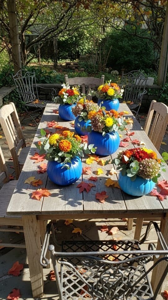Basket pumpkins bring warmth, but blue and white pumpkin flowers feel fresh and calming. I find these arrangements perfect for modern farmhouse or rustic styles.