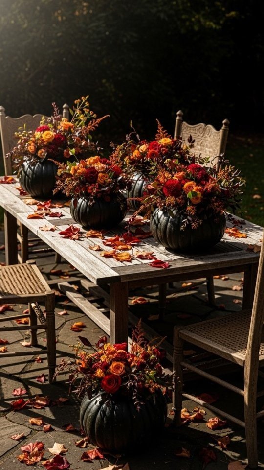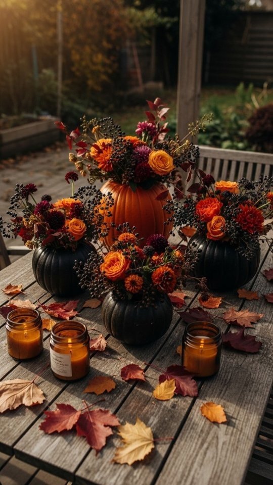 Black pumpkins paired with orange blooms create striking fall decor. I love how the dark shade adds mystery to any setting. Bright flowers like silk or foam roses pop against the deep black base.