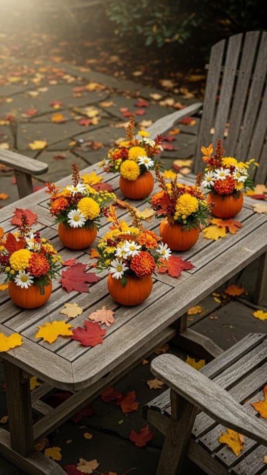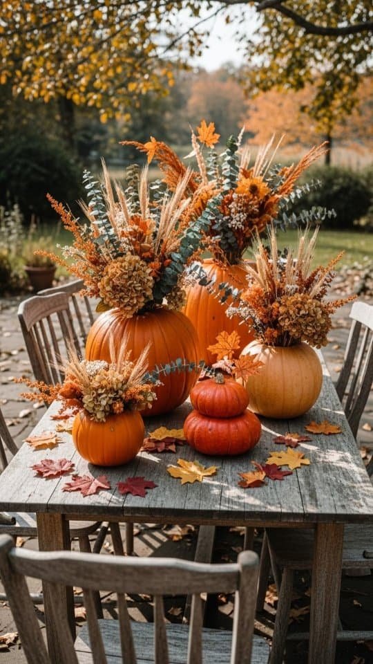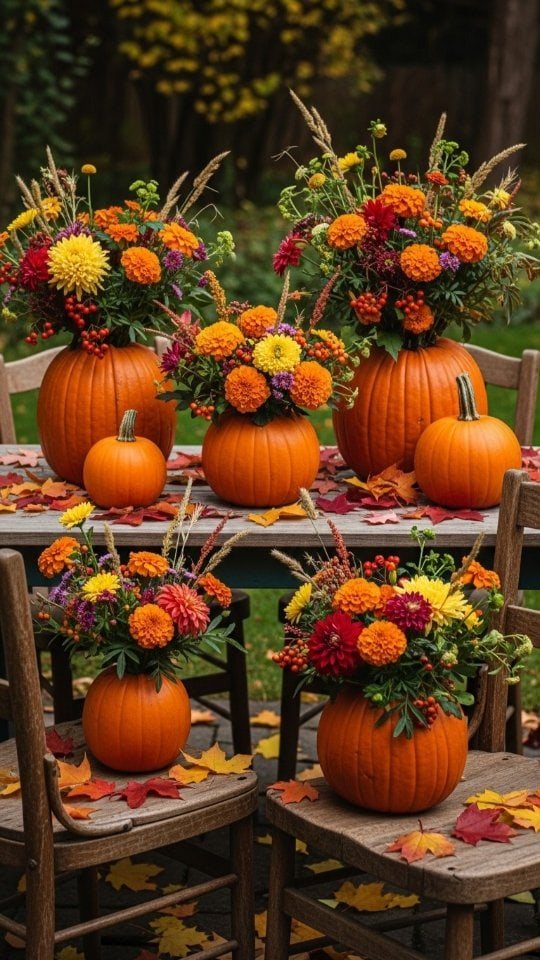 Orange pumpkins make perfect fall decor. I fill medium-sized pumpkins with bright flowers like dahlias and zinnias. They sit well on rustic wooden tables, adding warmth to any room.