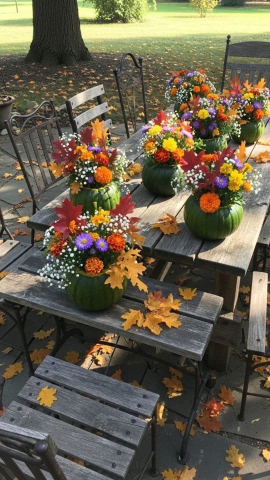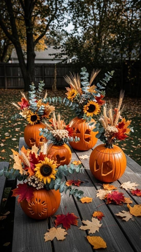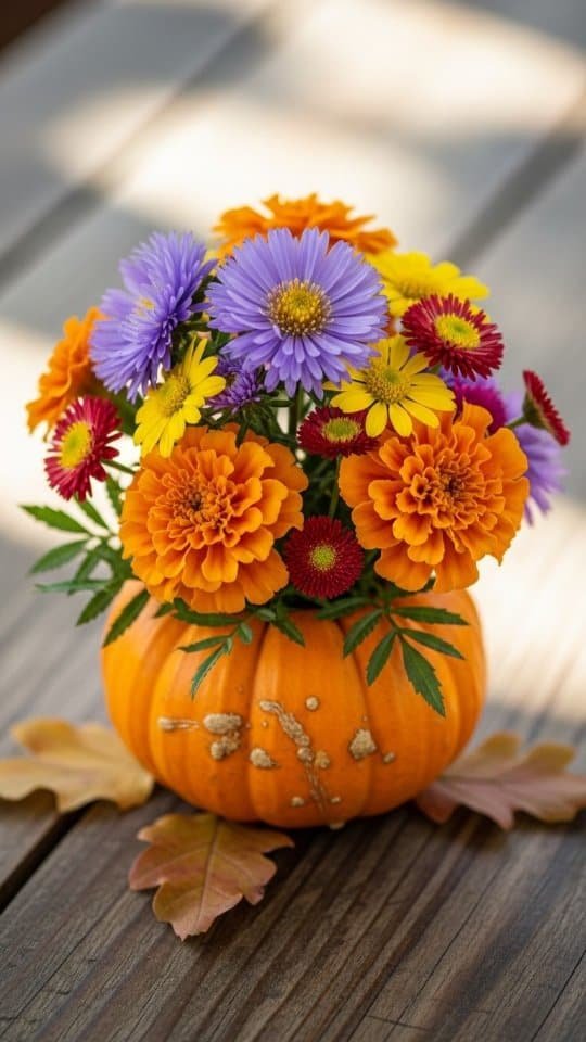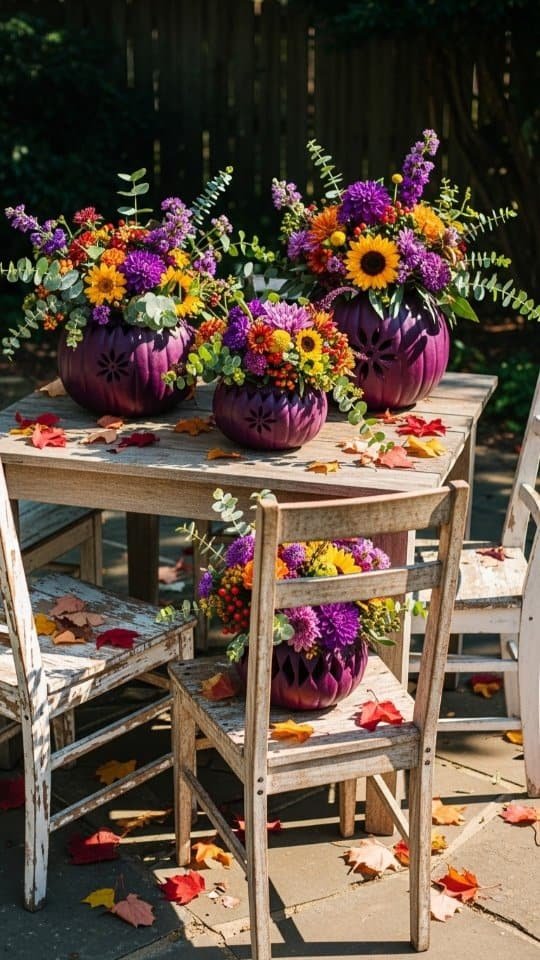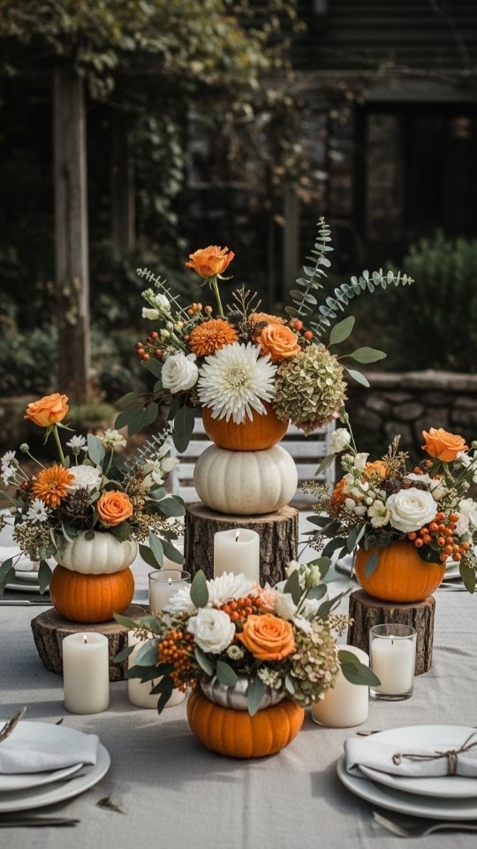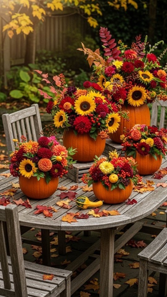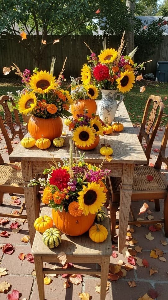 Tall pumpkins with vertical flowers steal the show at any autumn gathering. I like using sunflowers or dahlias for height and vibrant color. These arrangements add drama to tables while keeping a seasonal touch.