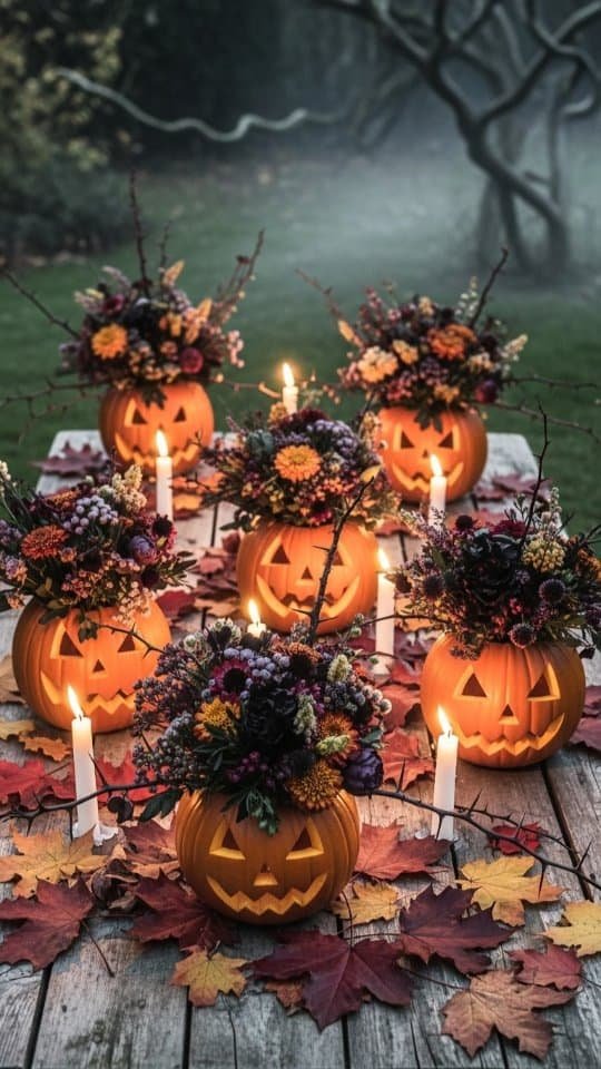 I love using carved pumpkins for Halloween flower arrangements. I pick a pumpkin, hollow it out, and add a small vase inside. This keeps the flowers fresh longer.