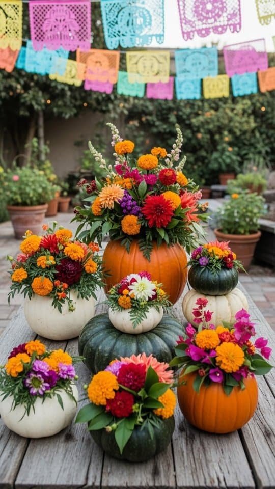 Bright pumpkins bursting with flowers remind me of Mexico’s vibrant celebrations. I love using marigolds, roses, and lilies to create bold displays.