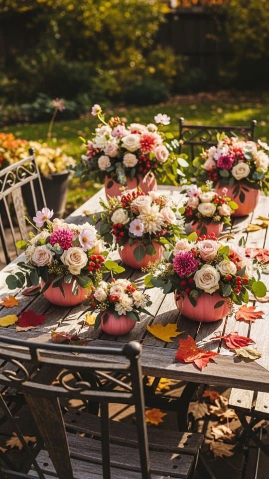 Soft pink pumpkins with fresh blooms feel magical. I love how they create a sweet, romantic mood for autumn.