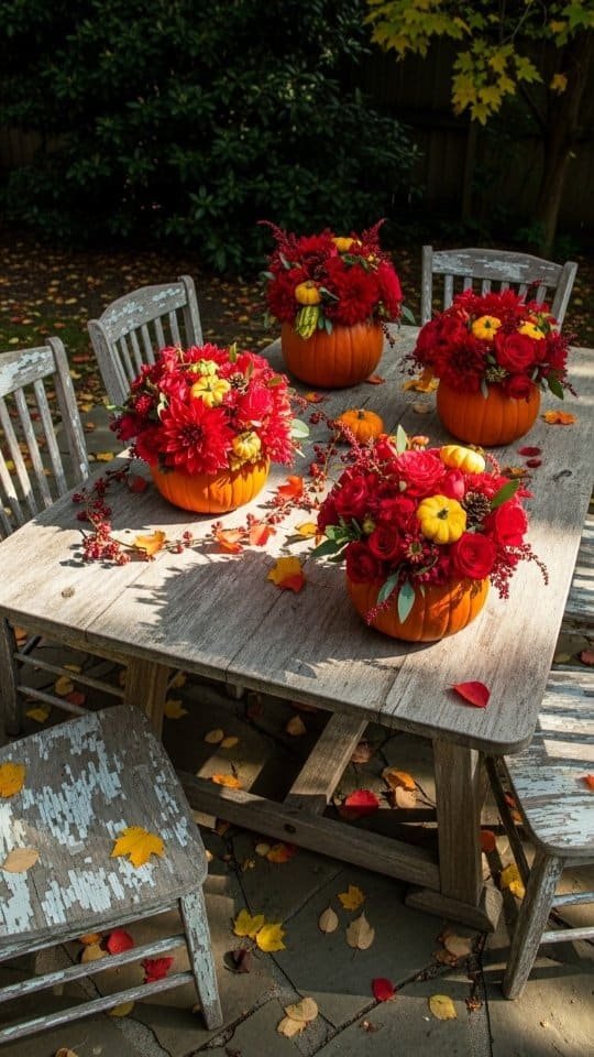 Rich red pumpkins filled with flowers create stunning fall decor. Bright blooms pop against the deep color, making eye-catching autumn centerpieces.