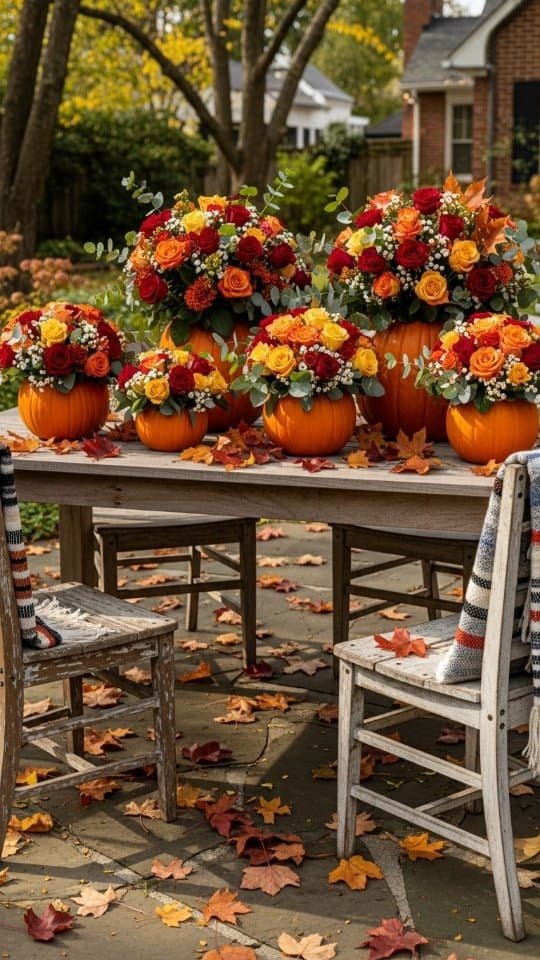 I love using pumpkins as vases for roses. They make such delicate, fragrant autumn centerpieces. Pairing roses with eucalyptus or wheat adds texture and charm. This mix feels timeless yet festive.