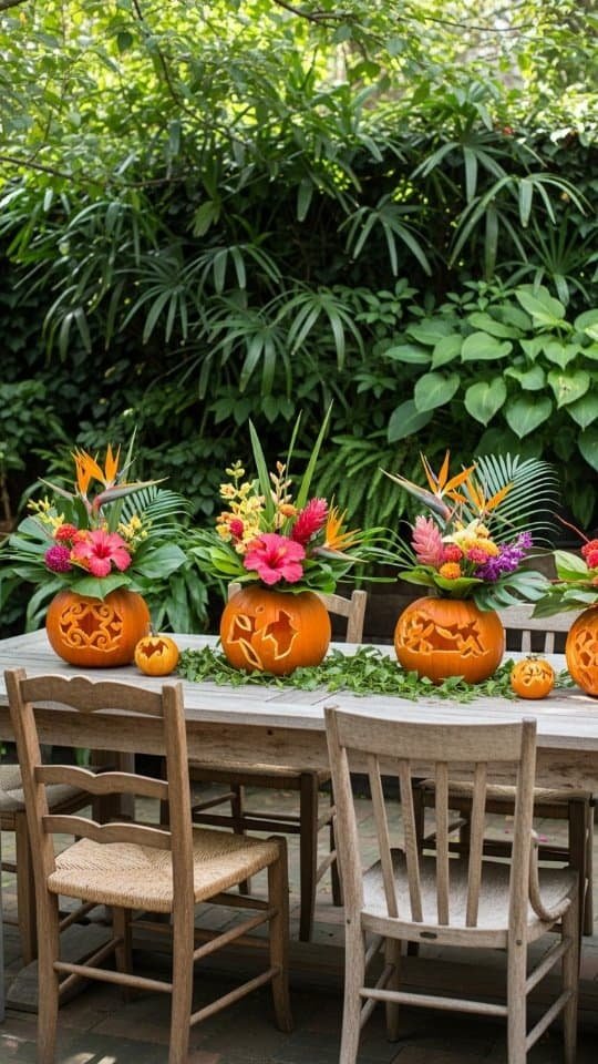 I love using tropical flowers like orchids and monstera leaves in pumpkins. They add a fresh twist to fall decor. Bright blooms make rustic pumpkins pop with color and life.