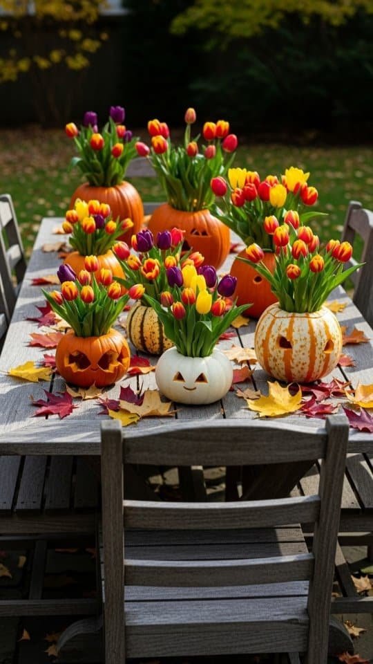 Carved pumpkins make the perfect vase for tulips. The bright tulip colors pop against the pumpkin’s orange shade, filling any table with fall spirit.