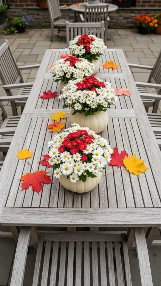 I often pair deep reds, oranges, or yellows with white pumpkins for contrast. Soft pinks or purples create a gentle look instead.