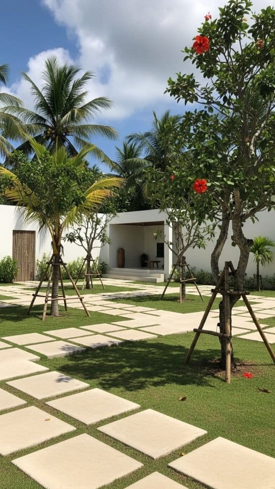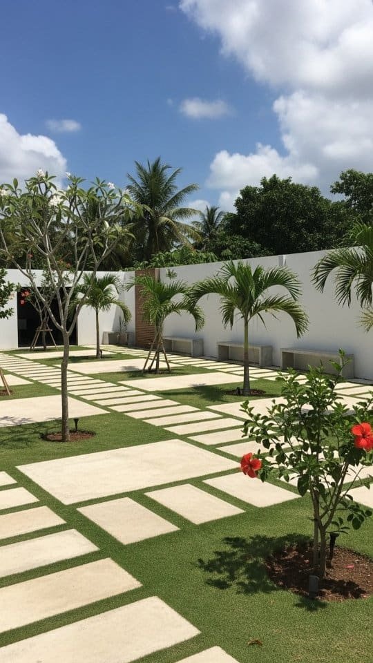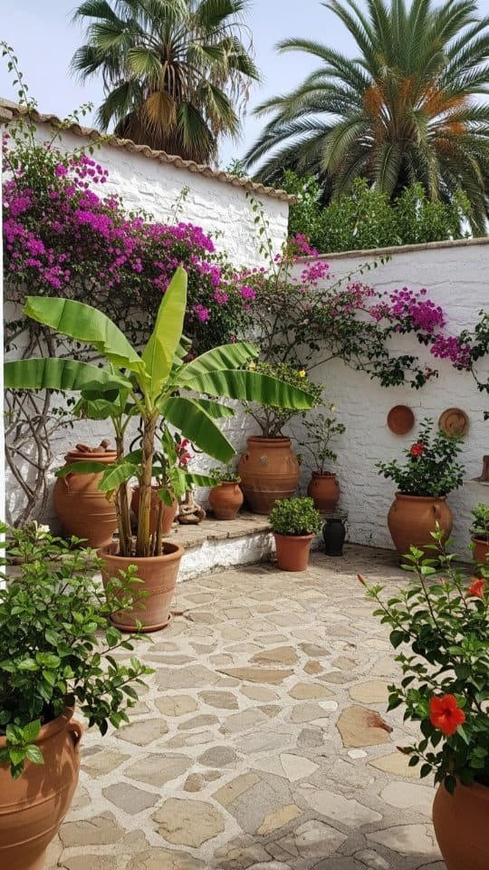 Terracotta pots bring charm, but clean paving lines and palms create elegance. I love how bold tropical plants balance with simple paths for a sleek look.