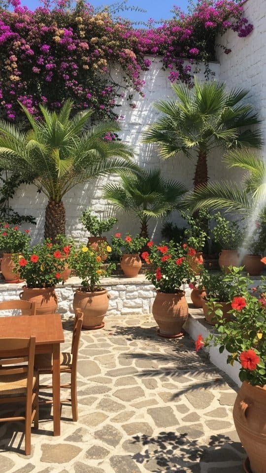 Terracotta pots highlight the natural beauty of palms and hibiscus. These plants thrive in full sun with well-draining soil, making them perfect for Mediterranean climates like those in Greece or Spain.