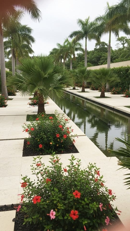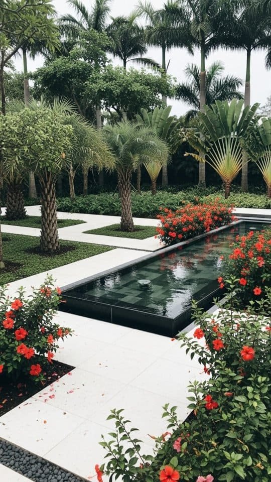 I like how sleek water features can make a garden look modern. Symmetrical palms and hibiscus add balance, creating a resort-like feel.