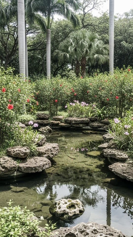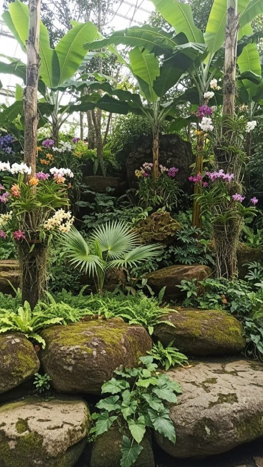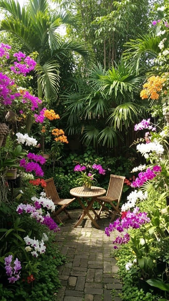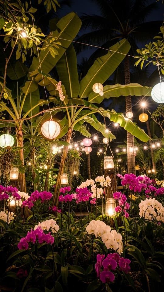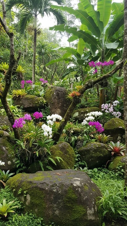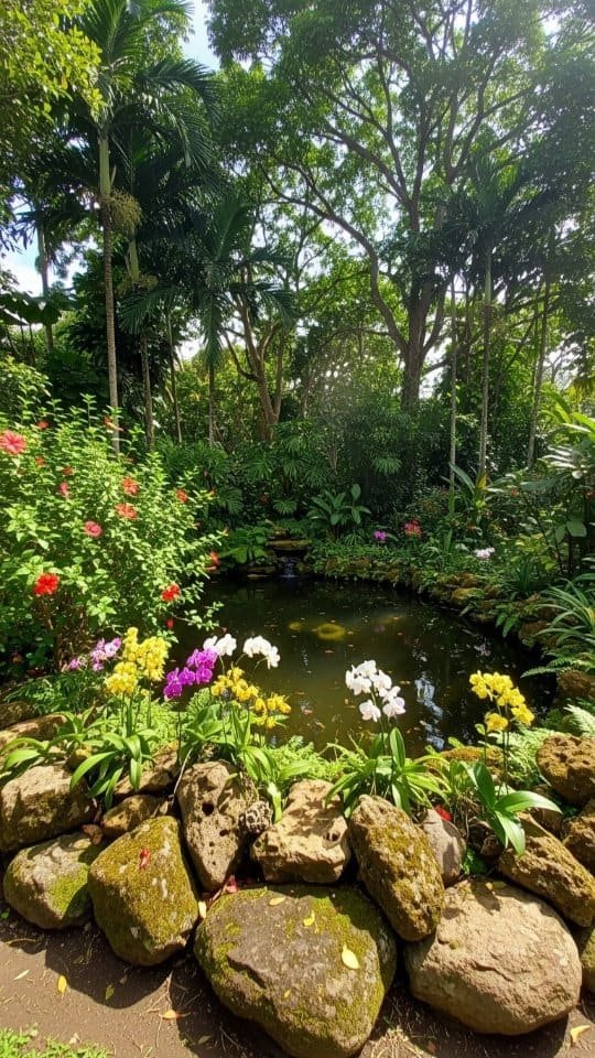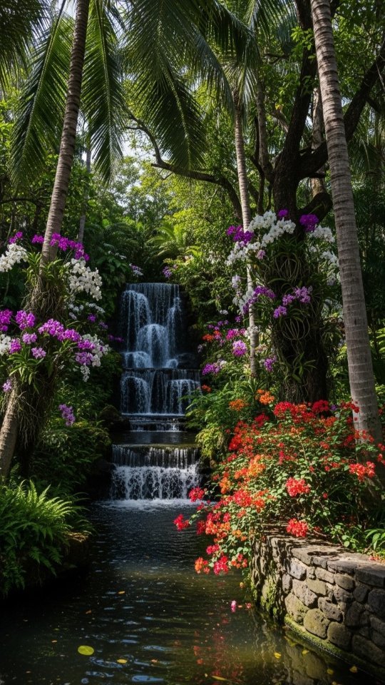 A cascading waterfall brings calm and beauty to any tropical garden. I like framing mine with vibrant orchids, which adds color and charm. Palm trees or banana plants around the water feature make it feel lush and alive.