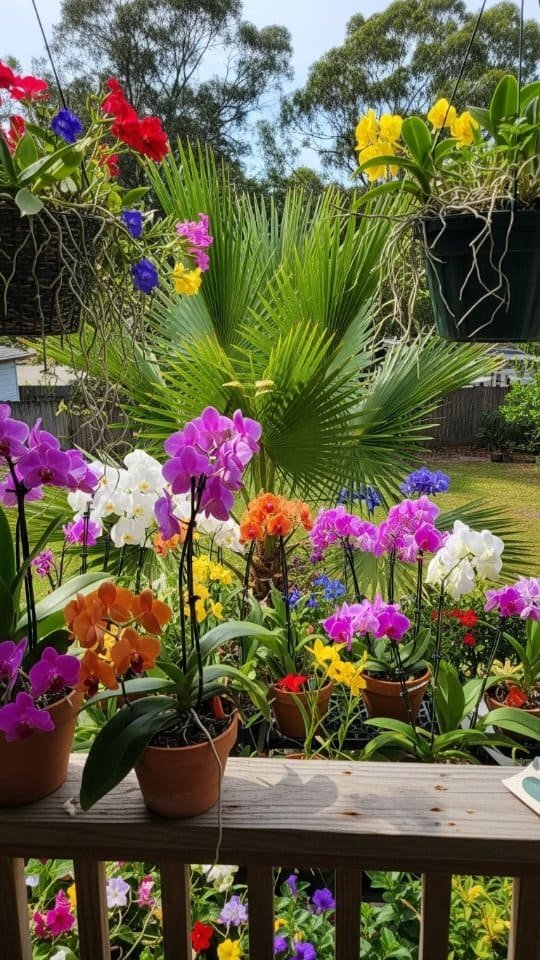 Placing all containers before planting helps plan each corner perfectly. These cozy setups feel alive with tropical magic! Up next are ideas for balconies overflowing with hanging orchids.