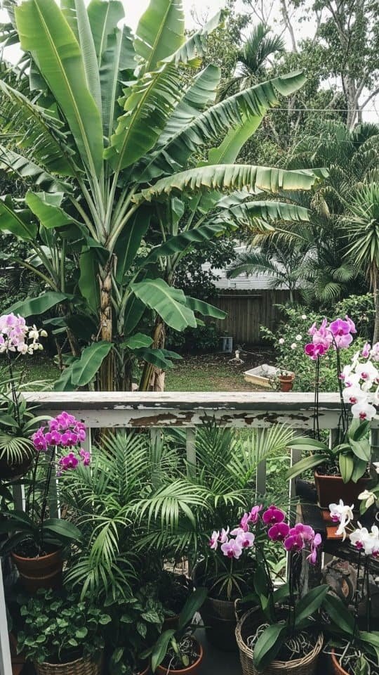 Bright orchids and lush palms turn tiny spaces into vibrant paradise. To make a bold impact, I love using bananas, cannas, and elephant ears in large pots with good drainage.