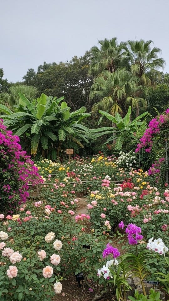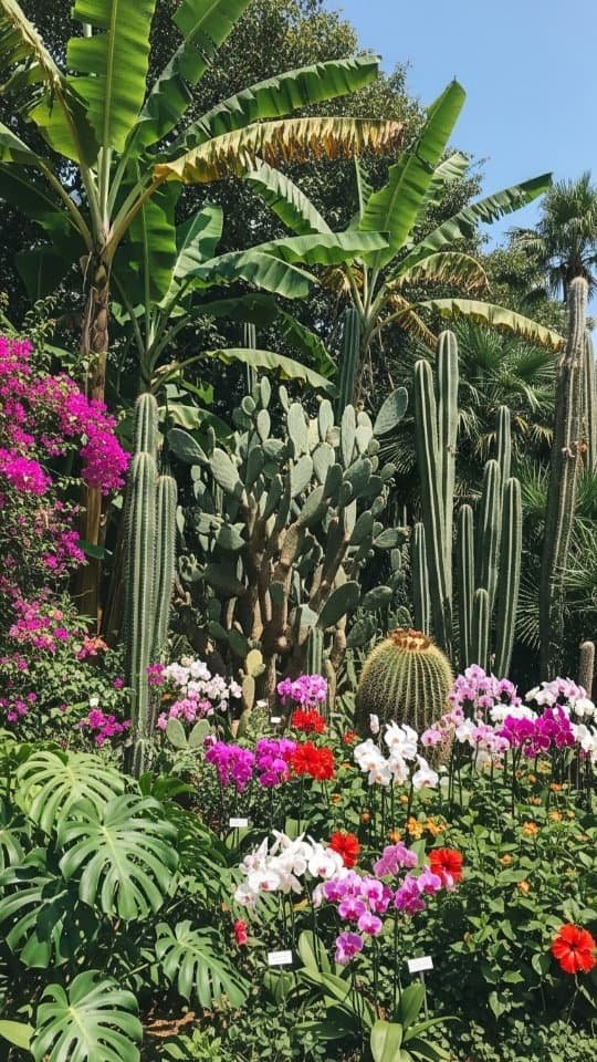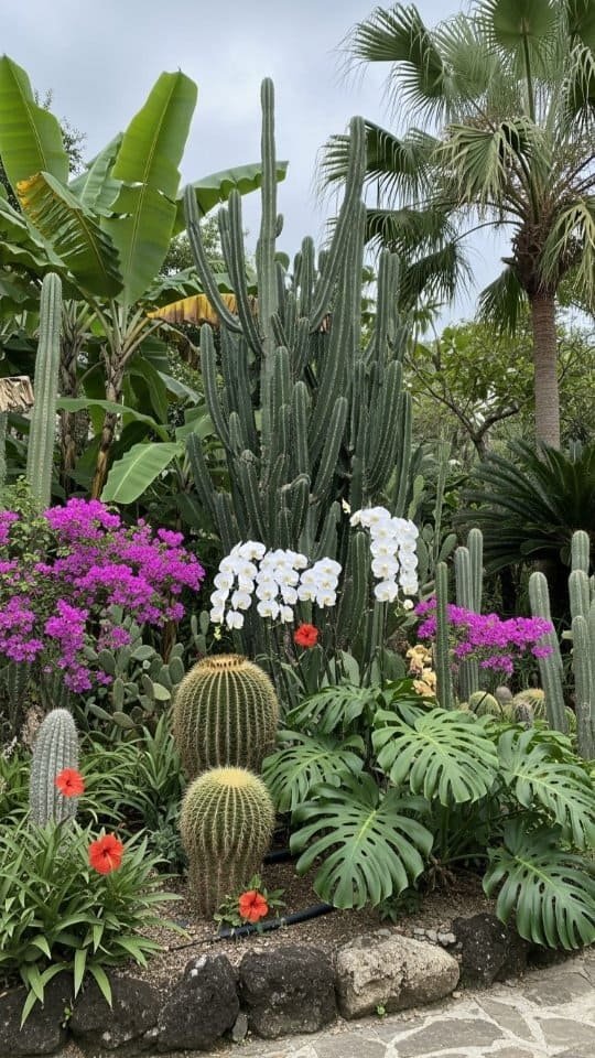 Orchids and cacti in the same garden? It works! I love how towering cacti bring height while hibiscus and orchids add bright colors. The mix of dry, spiky textures with soft blooms is stunning.