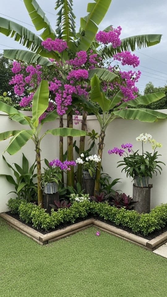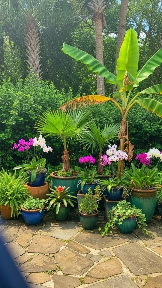 Big pots with tropical plants can make any corner feel alive. I love using bananas like the Red Abyssinian banana for bold height and texture. They grow fast and give that lush jungle vibe.