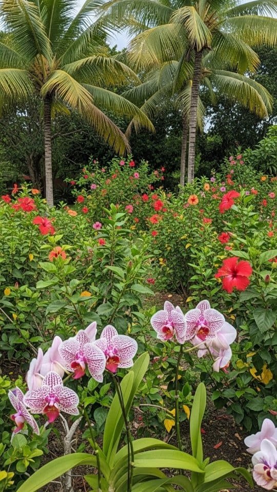 Orchids and hibiscus grow beautifully under coconut palms. Orchids love bright, indirect light and high humidity.
