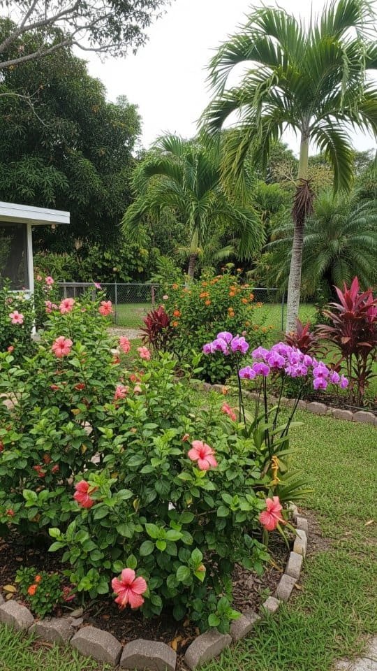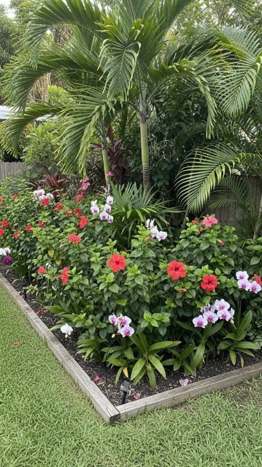 Mix hibiscus and roses for bold colors. Hibiscus adds tropical flair with large blooms, while roses give classic charm. Both thrive in well-draining, rich soil.