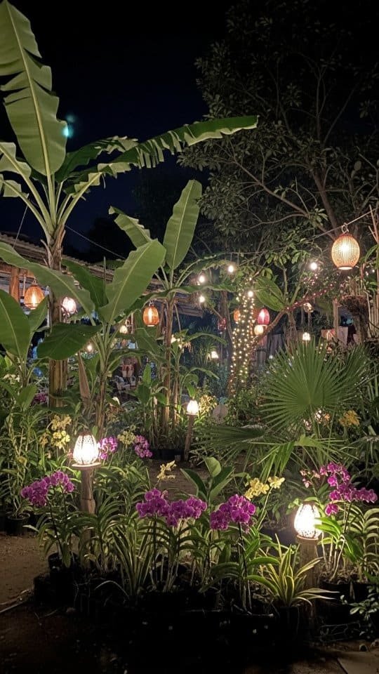 Large foliage like elephant ear and banana plants stand out without cluttering the space. Soft lighting, like lanterns or uplights, adds warmth at night.