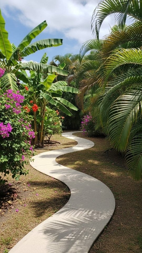 A curved pathway lined with palms feels like a tropical getaway. Adding bougainvillea and hibiscus along the edges fills the air with color.