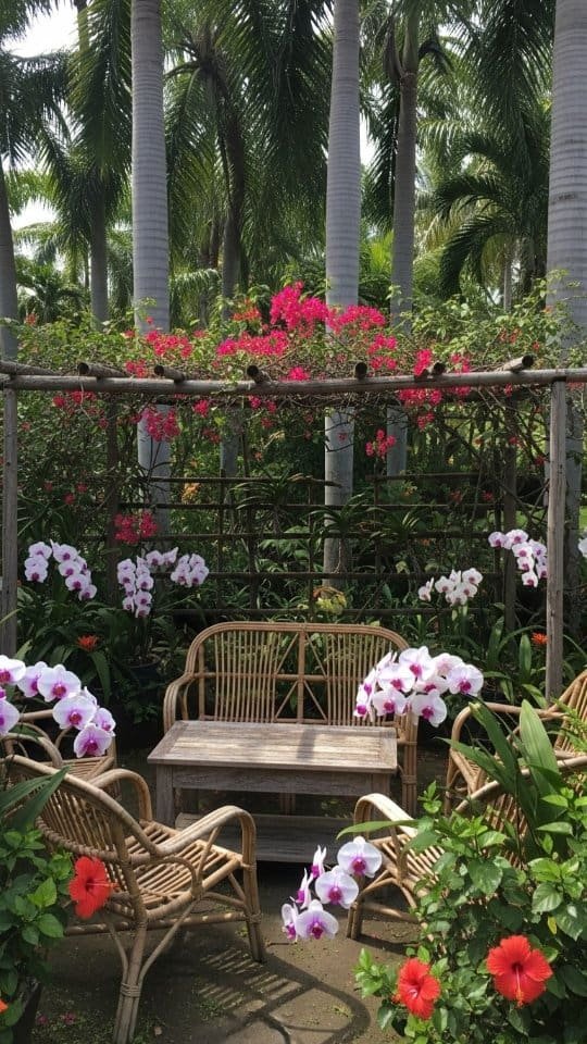I set up a cozy retreat with wicker chairs surrounded by vibrant orchids. The natural texture of the chairs blends beautifully with lush tropical plants.