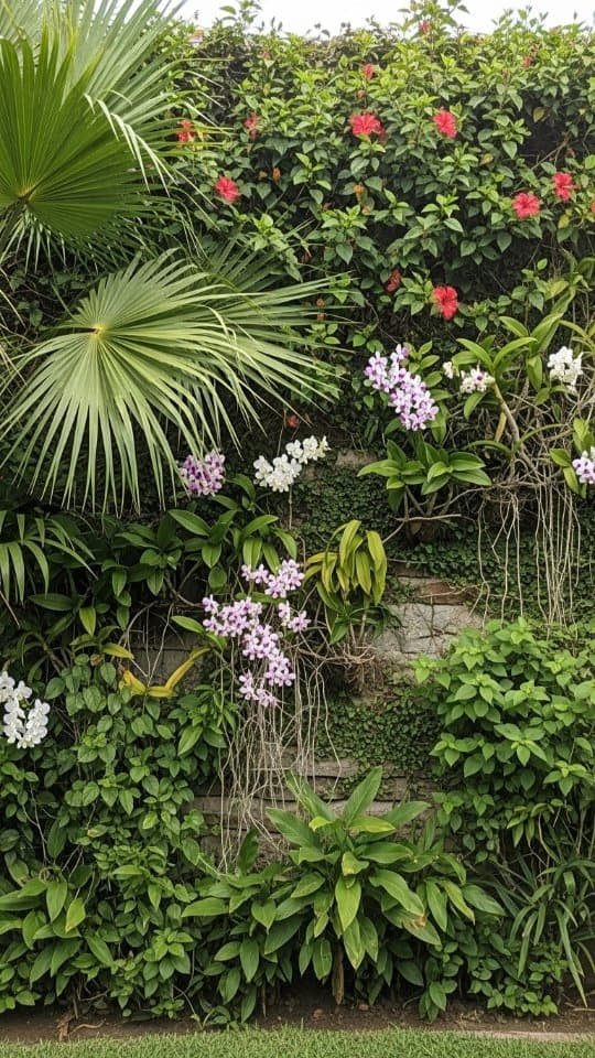 Living walls bring life to garden spaces. Orchids and hibiscus tumble down, adding bursts of color. Modular planters or trellises work well for building these vertical gardens.