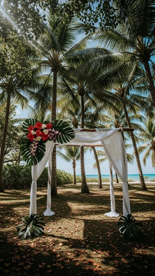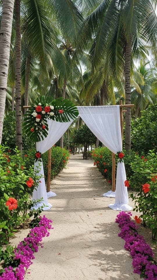A white draped arch with tall palms sets a dreamy wedding scene. The flowing fabric softens the space. Palms add texture and tie in the tropical garden design.